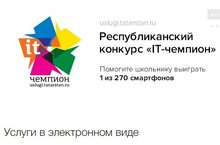 С 18 сентября 2018 года по 30 апреля 2019 года участники Конкурса - учащиеся общеобразовательных учреждений - помогают взрослым пользоваться Порталом государственных и муниципальных услуг Республики Татарстан и Мобильным приложением "Услуги РТ". За совершение транзакций Пользователи получают баллы, которые начисляются школьнику. Школьники, набравшие больше всех баллов получат смартфоны.