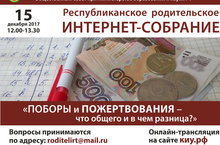 15 декабря пройдёт республиканское родительское интернет-собрание на ему "ПОБОРЫ и ПОЖЕРТВОВАНИЯ - что общего и в чём разница?". Вопросы принимаются по адресу: roditelirt@mail.ru. Онлайн-трансляция на сайте киу.рф