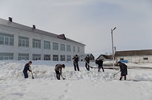 Учащиеся школы принимают активное участие в субботниках. Они раскидывают снег, который накопился в течение зимы.