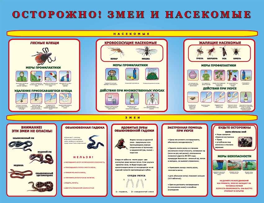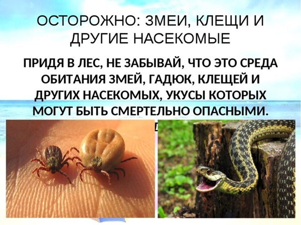 Во время нахождения детей на природе необходимо быть особенно осторожными. В траве, на деревьях могут находиться опасные насекомые и змеи.