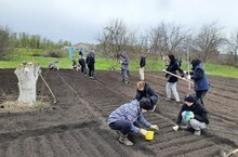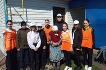 Отряд волонтеров оказывает помощь по уборке придомовой территории пожилым людям.