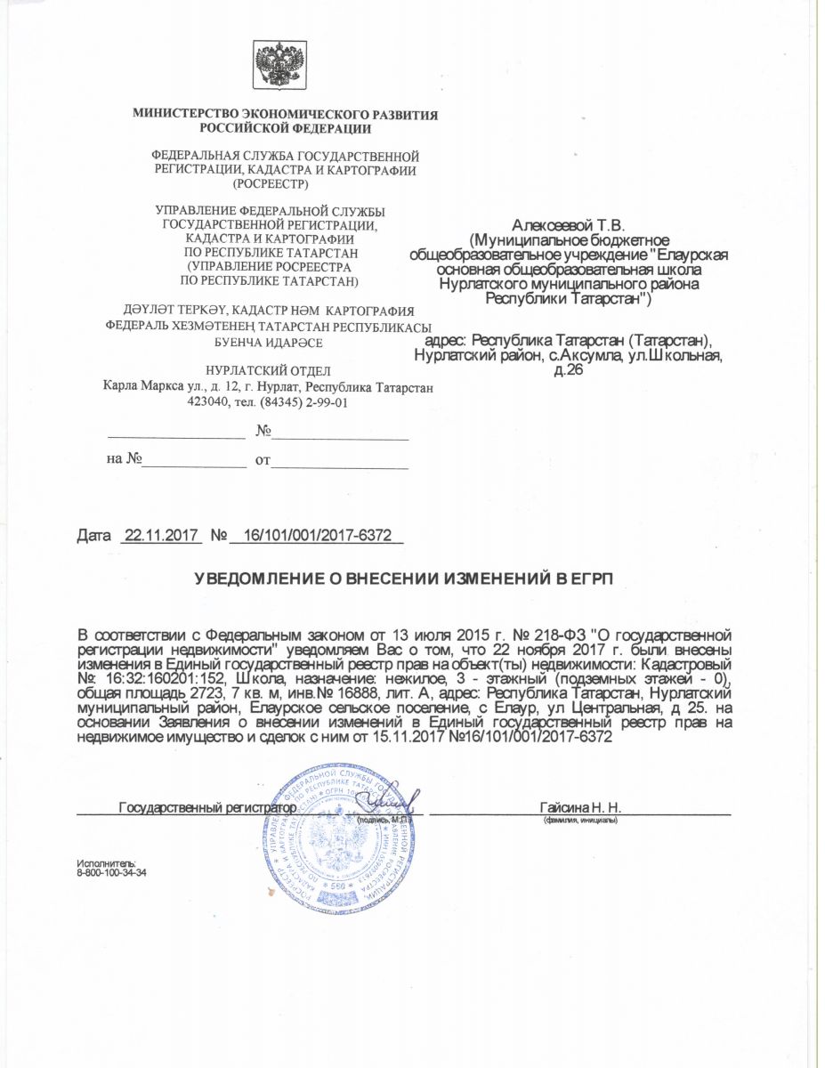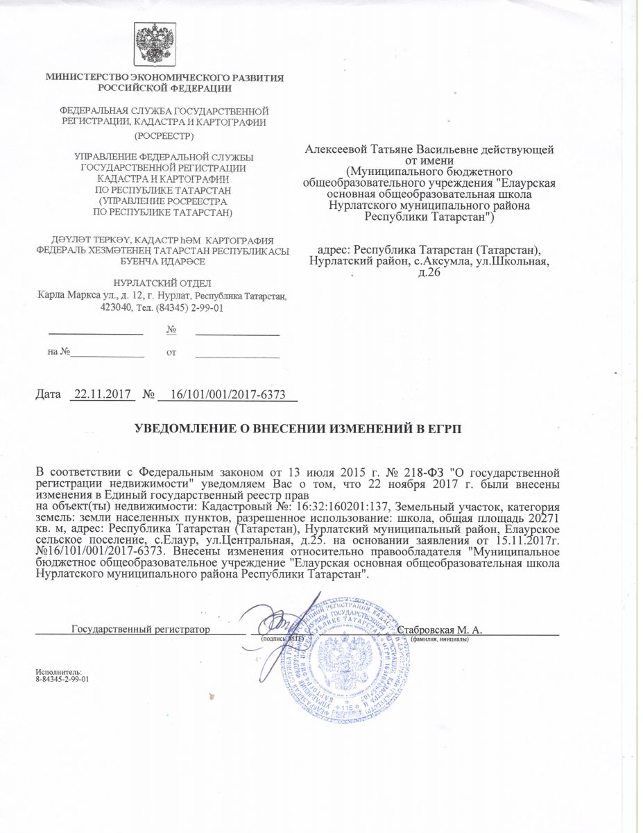 Уведомление о внесении изменений в ЕГРП земельный участок