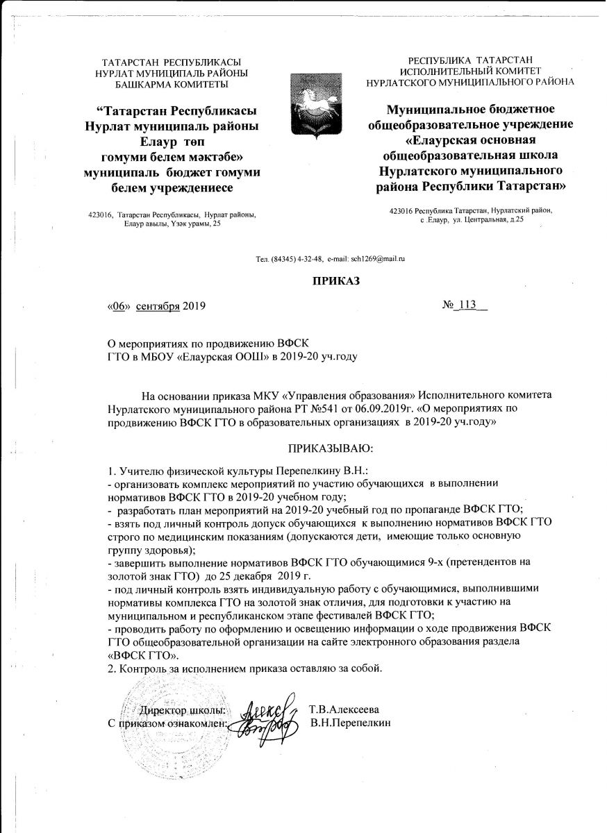 Приказ о мероприятиях по продвижению ВФСК ГТО в 2019-2020 учебном году