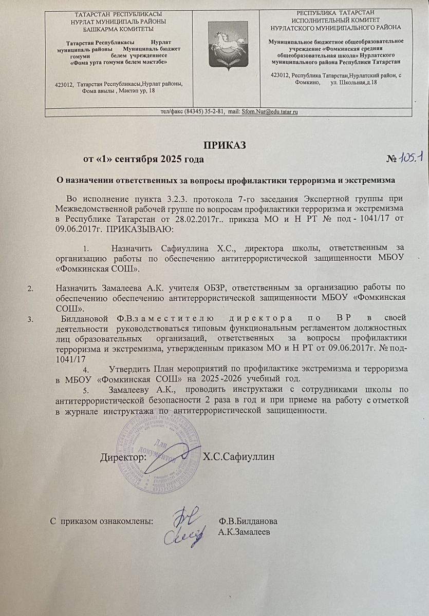 - Приказ о назначении ответственных за вопросы профилактики терроризма и экстремизма 2025 -2026 учебный год