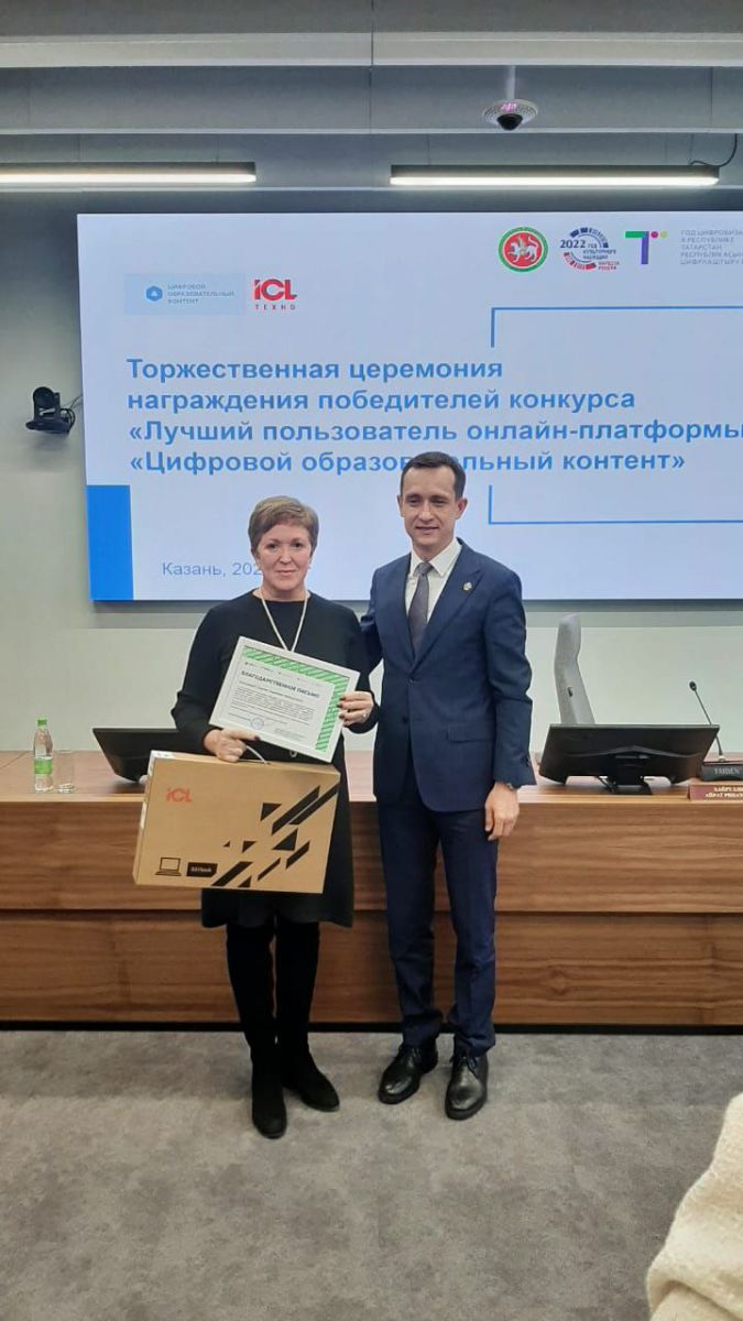 Сегодня в г. Казань на базе ИТ- парка имени Башира Рамеева состоялась торжественная церемония награждения победителей конкурса "Лучший пользователь онлайн-платформы " Цифровой образовательный контент" из числа педагогических работников образовательных организаций Республики Татарстан. Файзуллина Гузалия Хадыевна, учитель начальных классов школы √ 1 - победитель данного конкурса и обладатель нового ноутбука. Поздравляем её с победой -