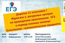 Ждем вас в ресурсных центрах по проведению практикумов ЕГЭ в период осенних каникул по естественно –математическим и гуманитарным предметам.ШКОЛА № 9 по адресу г. Нурлат ул. Самаренкина д. 4