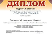 Средняя школа №4, театральный коллектив «Диалог» (руководитель – Лизунова Р.С.), стал лауреатом II степени на международном конкурсе!
