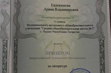 Учащаяся школы №2 Евдокимова Арина стала призером Всероссийской олимпиады школьников по литературе на заключительном этапе в г.Москва