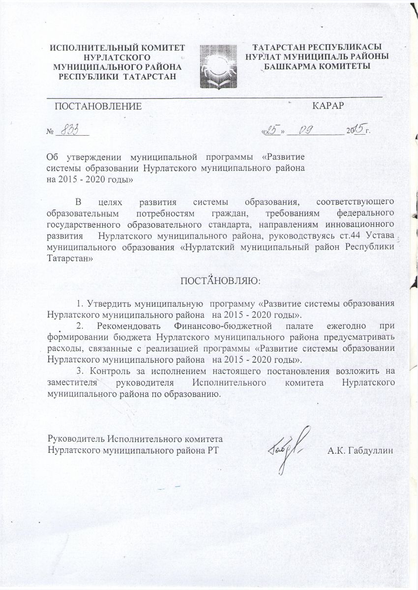 Муниципальная программа "Развитие системы образования Нурлатского муниципального района на 2015-2020годы" / "2015 -2020 нче елларга Нурлат муниципаль районы мәгариф системасы үсеше" муниципаль программасы