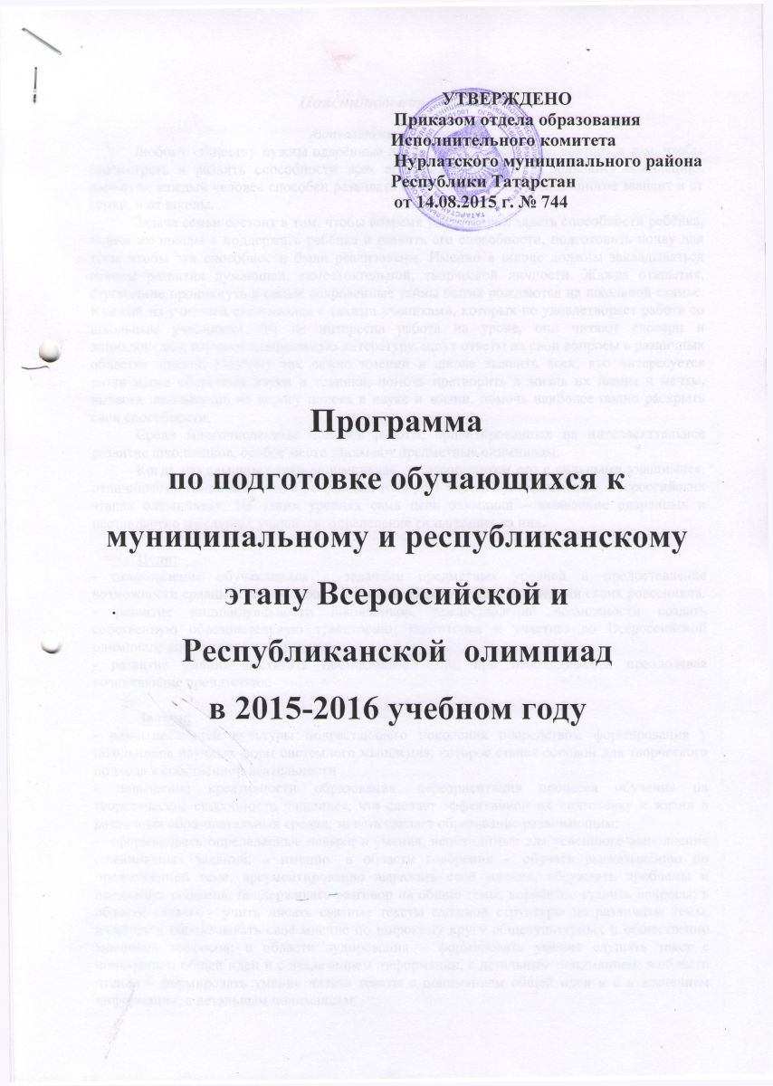 Программа по подготовке обучающихся к муниципальному и республиканскому этапу Всероссийской и Республиканской олимпиад / Укучыларны Бөтендөнья һәм Республика олимпиадаларының муниципаль һәм республика этабына әзерлек программасы