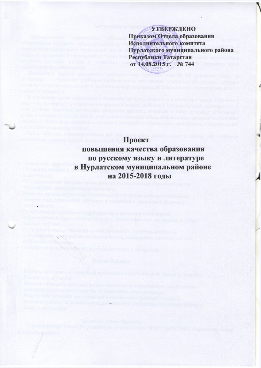Проект повышения качества образования по русскому языку и литературе на 2015-2018 годы / 2015-2018 нче елларга рус теле һәм әдәбиятыннан белем сыйфатын күтәрү проекты