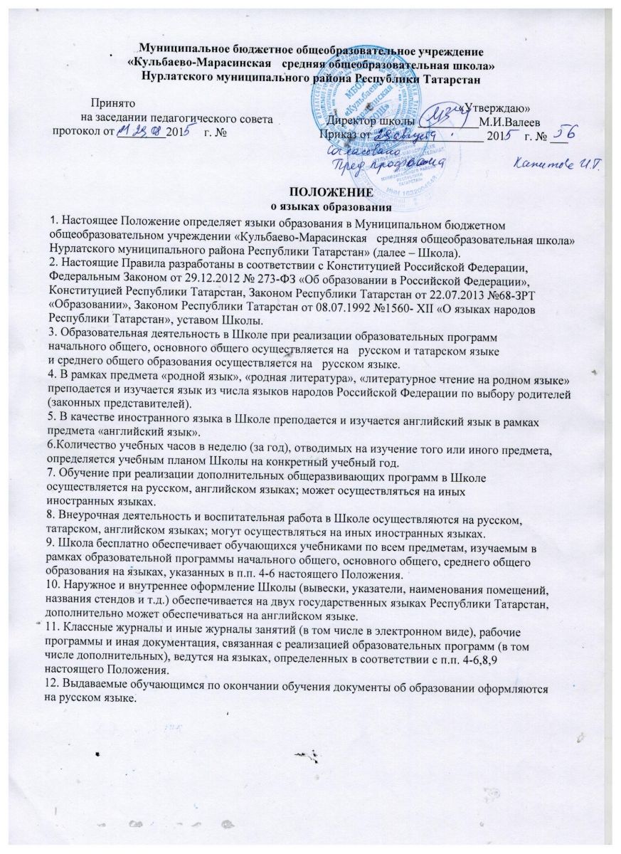 Локальные нормативные акты, регламентирующие организационные аспекты деятельности МБОУ "Кульбаево-Марасинская СОШ"