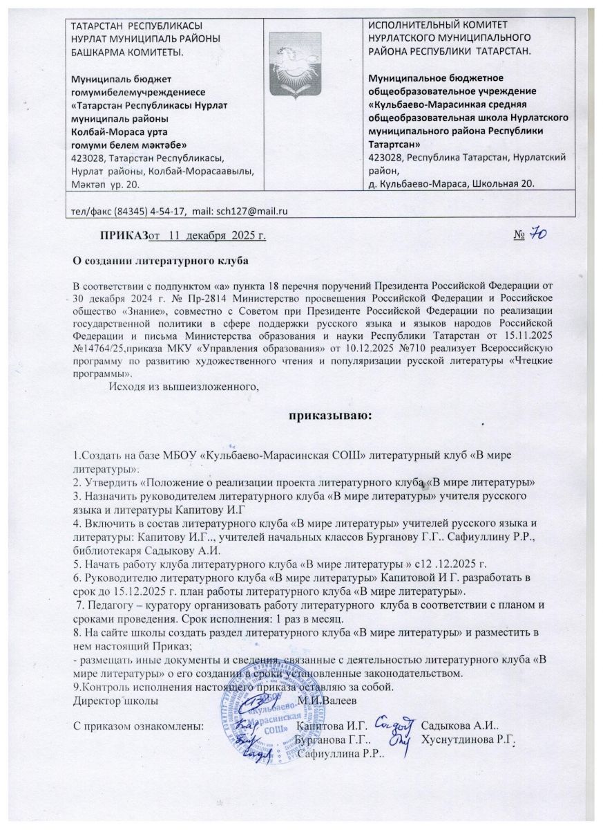 | Короткое название: | МБОУ "Кульбаево- Марасинская СОШ" Нурлатского муниципального района РТ |