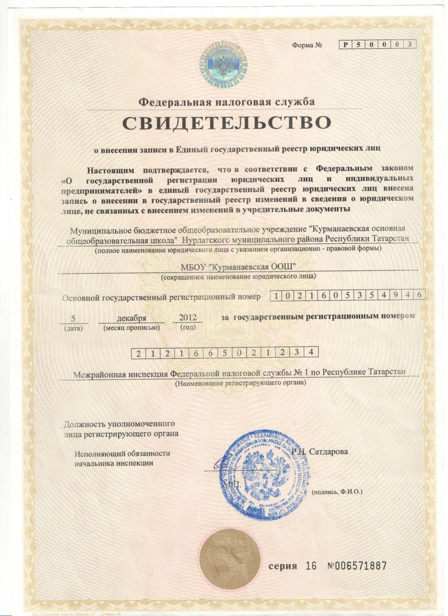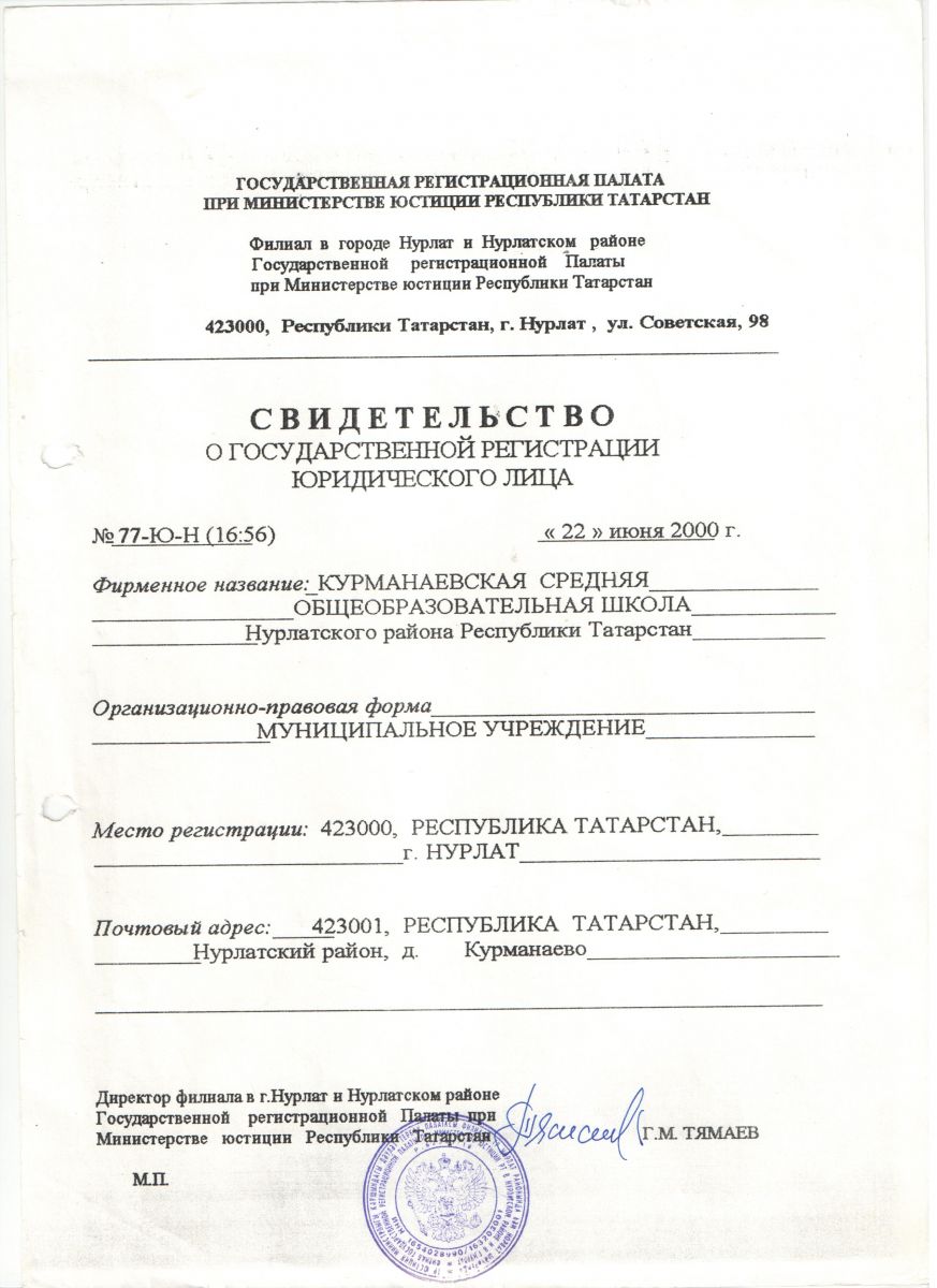 Свидетельство о государственной регистрации юридического лица/Юридик затның дәүләт теркәвен алу турында таныклык