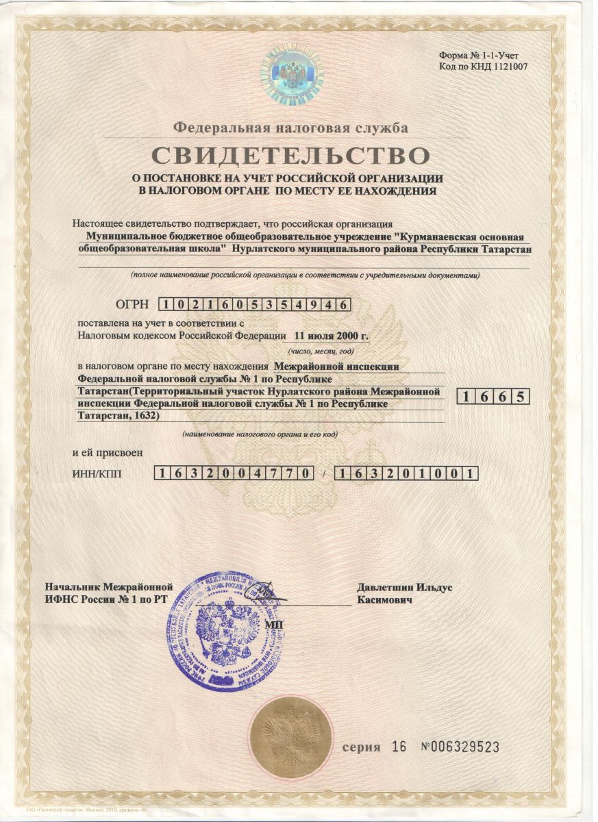 СВИДЕТЕЛЬСТВО О ПОСТАНОВКЕ НА УЧЕТ РОССИЙСКОЙ ОРГАНИЗАЦИИ В НАЛОГОВОМ ОРГАНЕ ПО МЕСТУ ЕЕ НАХОЖДЕНИЯ