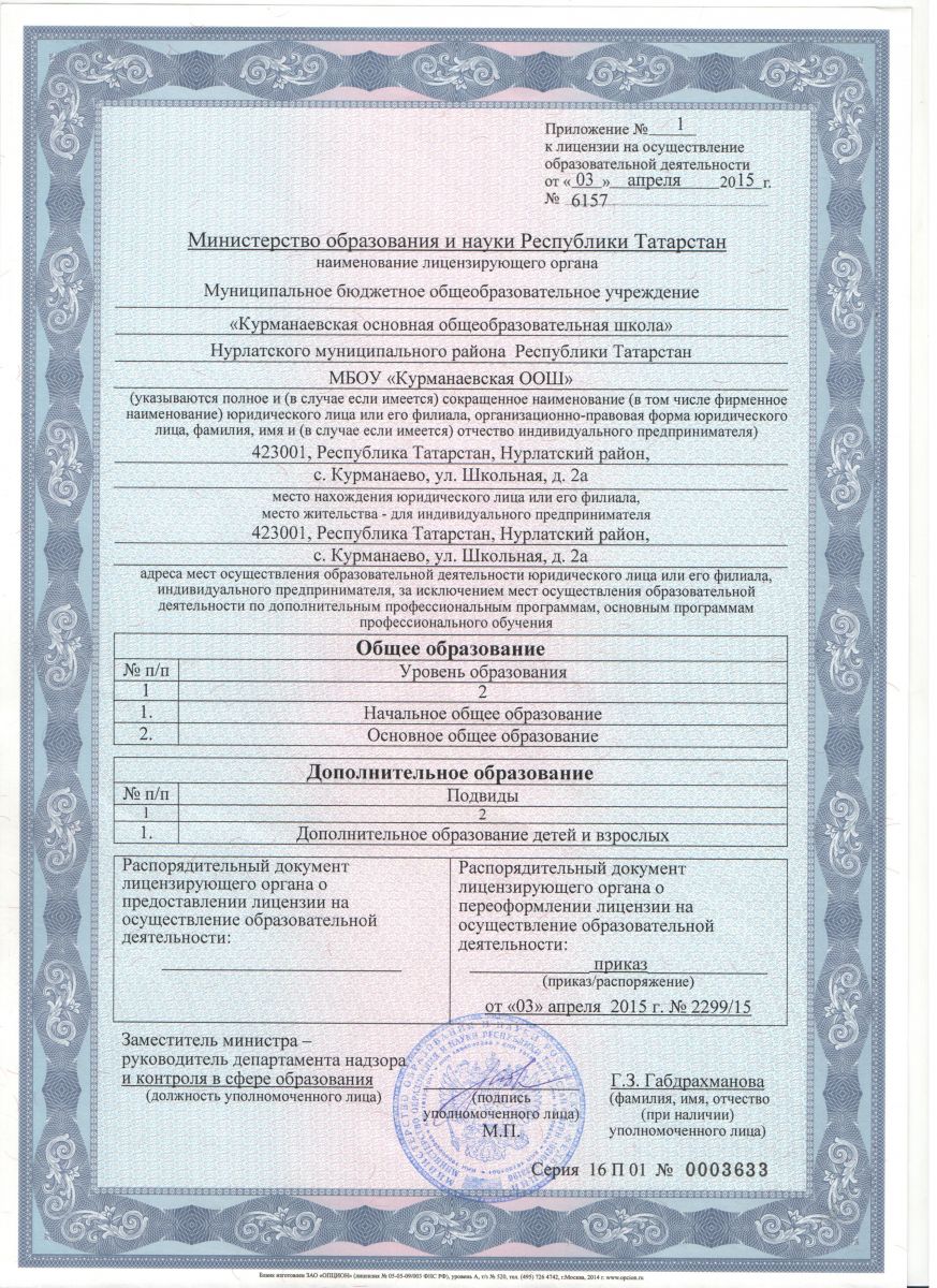 Приложение к лицензии на осуществление образовательной деятельности/ Белем бирү эшчәнлеген гамәлгә ашыру турында лицензияга өстәмә