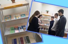 Учитель обществознания Калимуллина Флюра Исмагиловна с учащимися 11 кл. у книжной выставки "Правовые знания" в читальном зале./Җәмгыять белеме укытучысы Кәлимуллина Флюра Исмәгыйль кызы 11 сыйныф укучылары белән "Хокукый белемнәр" китап күргәзмәсе янында уку залында.
