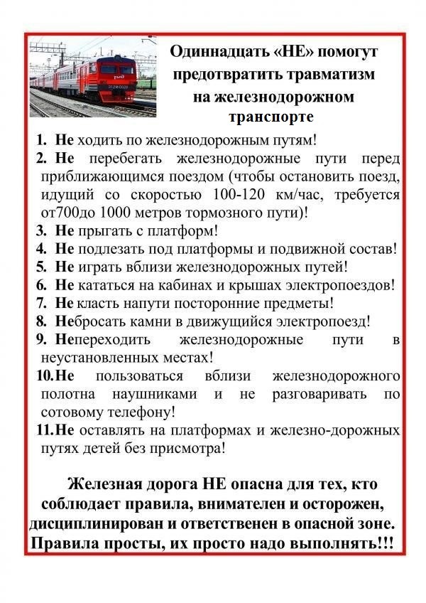 При приближении поезда не выходите за предупреждающую полосу на платформе до полной остановки поезда; посадку (высадку) в вагоны производите только после полной остановки поезда, со стороны перрона или посадочной платформы; при приближении поезда детей держите за руки или на руках. Не оставляйте их без присмотра на посадочных платформах и в вагонах; не оставляйте без внимания случаи нарушения правил поведения несовершеннолетних детей на территории железнодорожного транспорта; переходите железнодорожные пути только в установленных местах, убедившись в отсутствии движущегося поезда, локомотива или вагонов; не подлезайте под вагонами. Не переходите через железнодорожные пути в неустановленных местах, не перебегайте перед проходящим поездом. Помните, что поезд сразу остановить нельзя. Для перехода через железнодорожные пути пользуйтесь переходными мостами, пешеходными настилами и переездами, обращайте внимание на указатели, прислушивайтесь к подаваемым звуковым сигналам.