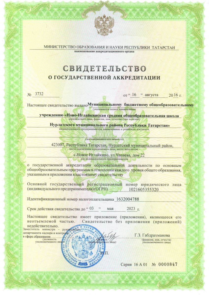 Муниципальное бюджетное общеобразовательное учреждение «Ново-Иглайкинская средняя общеобразовательная школа Нурлатского муниципального района Республики Татарстан» / «Татарстан Республикасы Нурлат муниципаль районы Яңа Иглай урта гомуми белем мәктәбе» муниципаль бюджет гомуми белем бирү учреждениесе