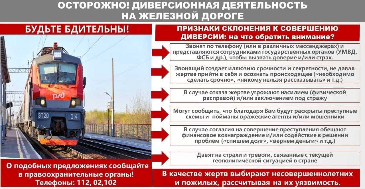 Опубликовано: 26.12.2024Уважаемые родители! В настоящее время через различные социальные сети и мессенджеры ведется активная вербовка лиц для совершения различных диверсий на объектах железнодорожного транспорта (поджоги релейных шкафов, тягового подвижного состава, разрушение средств сигнализации и связи, стрелочных переводов и др.) за денежное вознаграждение. Особой группой риска являются подростки! За легкие, как им кажется, деньги они совершают деяния, опасность которых не осознают в полной мере. Данную деятельность курируют взрослые лица, имеющие опыт преступной деятельности. Ими даются четкие инструкции о том, какие действия нужно выполнить, в том числе по предупредительным мерам: как скрыть факт совершения диверсии, как пользоваться сотовой связью. В уголовном праве Российской Федерации под термином «диверсия» подразумеваются действия, направленные на экономическое и оборонное ослабление страны. Ответственность за совершение диверсий несут как граждане РФ, так и иностранные граждане и лица без гражданства, которые достигли к моменту совершения преступления 16-летнего возраста. Совершение диверсий гражданином РФ по заданию иностранной разведки или иностранной организации квалифицируется по совокупности с государственной изменой по ст. 275 и 281 УК РФ. Преступление относится к категории особо тяжких, санкция статьи предусматривает наказание в виде лишения свободы от 10 лет до 20 лет либо пожизненное лишение свободы.