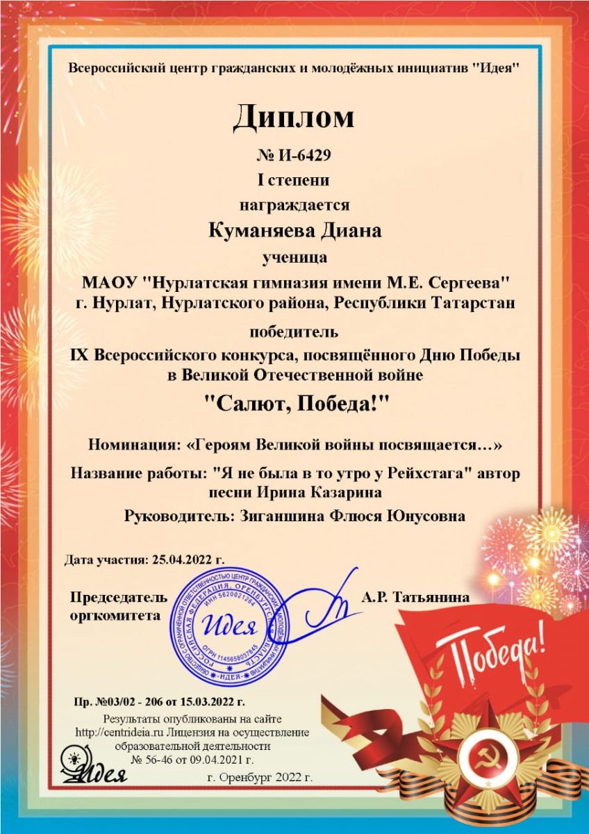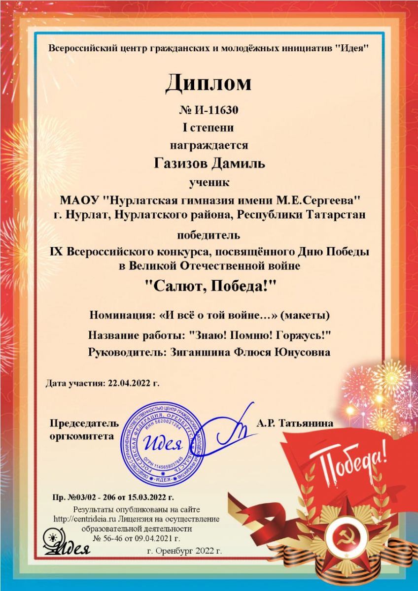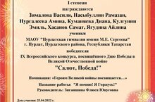 Гимназиянең 4 А сыйныфы укучыларын котлыйбыз, алар Бөек Ватан сугышында Җиңү көненә багышланган " Салют, Җиңү" Бөтенрәссәй конкурсы җиңүчеләре! җитәкчесе: Җиһаншина Ф. Ю.