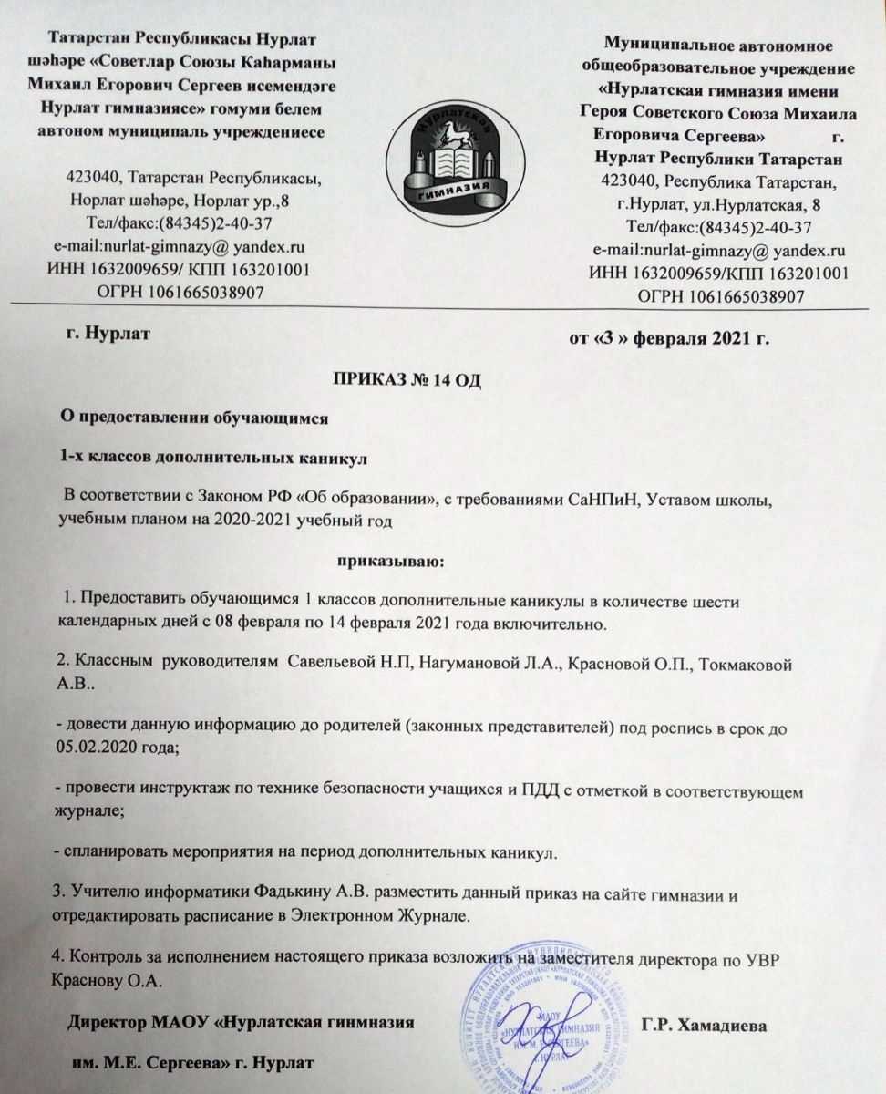 Обучающимся 1 классов предоставляются дополнительные каникулы с 8 по 14 февраля 2021г