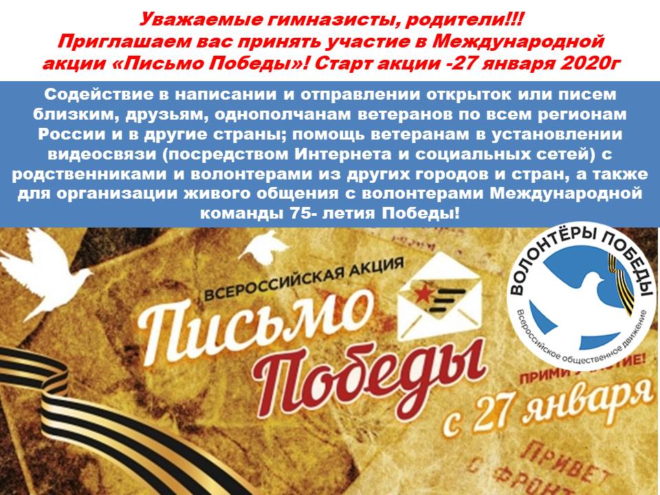 Приглашение на участие в Международной Акции "Письмо Победы" 22.01.2020