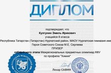 Поздравляем ученика 8 класса Нурлатской гимназии Эмиля Кулгунина с успешным выступлением на отборочном этапе Межрегиональной олимпиады школьников Казанского федерального университета по профилю «Химия».