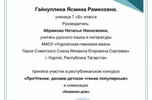 Гайнуллина Ясмина, ученица 7 «Б» класса, успешно приняла участие в Республиканском конкурсе «ПроЧтение: делаем детское чтение популярным», организованном Министерством образования и науки Республики Татарстан и ГАОУ ДПО «Институт развития образования Республики Татарстан».