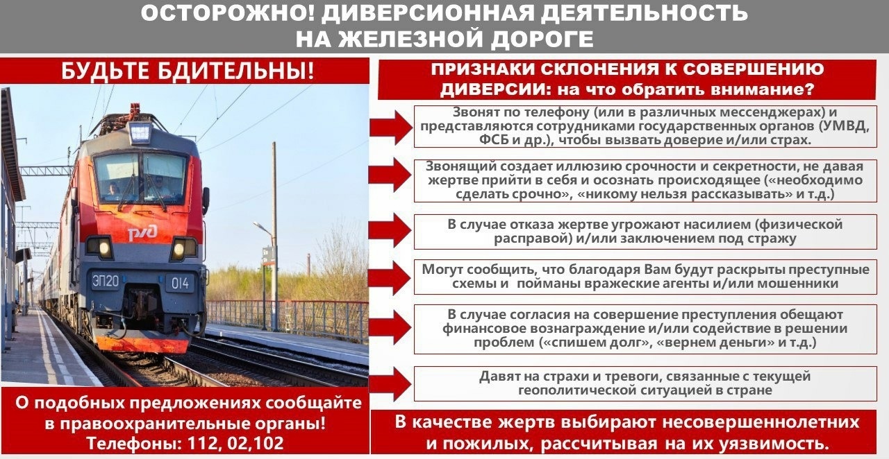 Опубликовано: 26.12.2024В настоящее время через различные социальные сети и мессенджеры ведется активная вербовка лиц для совершения различных диверсий на объектах железнодорожного транспорта (поджоги релейных шкафов, тягового подвижного состава, разрушение средств сигнализации и связи, стрелочных переводов и др.) за денежное вознаграждение. Особой группой риска являются подростки! За легкие, как им кажется, деньги они совершают деяния, опасность которых не осознают в полной мере. Данную деятельность курируют взрослые лица, имеющие опыт преступной деятельности. Ими даются четкие инструкции о том, какие действия нужно выполнить, в том числе по предупредительным мерам: как скрыть факт совершения диверсии, как пользоваться сотовой связью. В уголовном праве Российской Федерации под термином «диверсия» подразумеваются действия, направленные на экономическое и оборонное ослабление страны. Ответственность за совершение диверсий несут как граждане РФ, так и иностранные граждане и лица без гражданства, которые достигли к моменту совершения преступления 16-летнего возраста. Совершение диверсий гражданином РФ по заданию иностранной разведки или иностранной организации квалифицируется по совокупности с государственной изменой по ст. 275 и 281 УК РФ. Преступление относится к категории особо тяжких, санкция статьи предусматривает наказание в виде лишения свободы от 10 лет до 20 лет либо пожизненное лишение свободы.