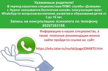 Если у вас возникло желание поделиться своей проблемой или вопросом анонимно, вы можете позвонить общественному помощнику Уполномоченного по правам ребенка в Республике Татарстан в Нурлатском муниципальном районе – Кныревой Алене Валерьевне (всё конфиденциально): 8-908-349-60-68.