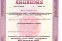 Наш детский сад получил лицензию Министерства Здравохранения РТна осуществление медицинской деятельности!!! Которая позваляет оказывать первичную, доврачебную, медико-санитарную помощь в амбулаторных условиях по: сестренскому делу в педиатрии. А также медицинские осмотры