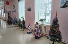 Новогоднюю атмосферу создает парад елок в коридоре школы