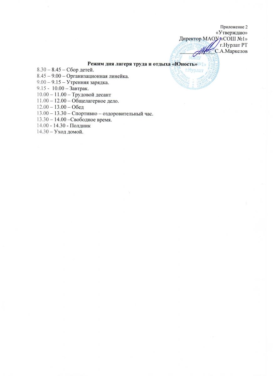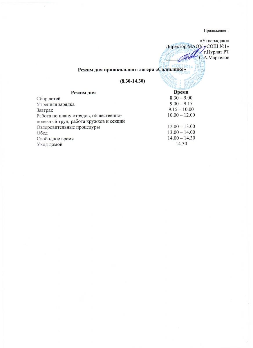 Режим работы пришкольного лагеря Солнышко