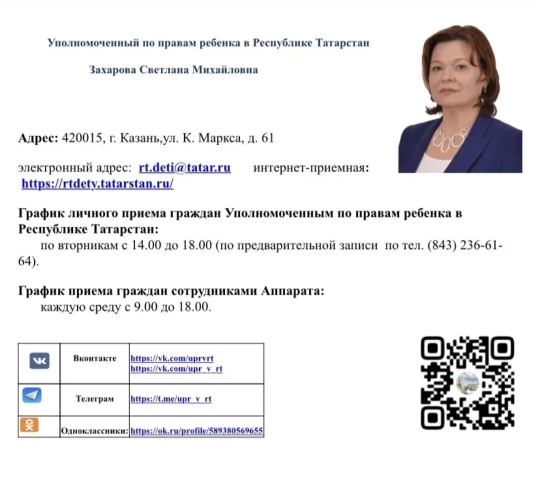 Уполномоченный по правам ребенка в Республике Татарстан - Захарова Светлана Михайловна