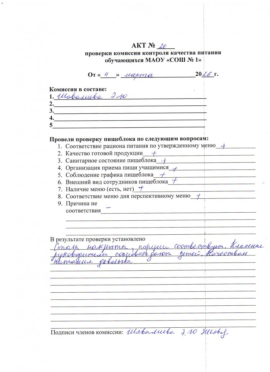 Акт № 20 проверки комиссии контроля качества питания обучающихся МАОУ СОШ № 1