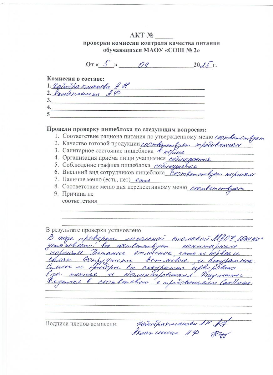 Акт проверки комиссии контроля качества питания от 05.09.2025