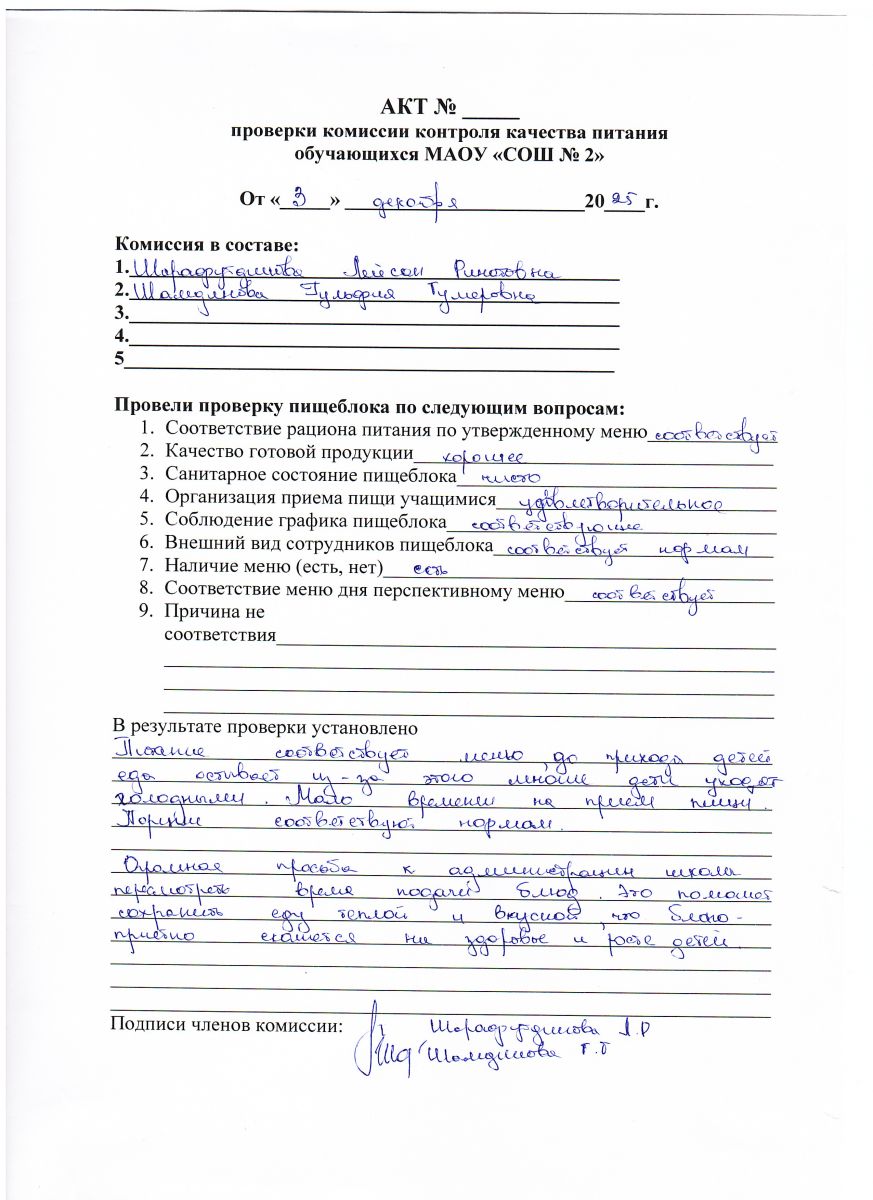 Акт проверки комиссии контроля качества питания от 03.12.2025