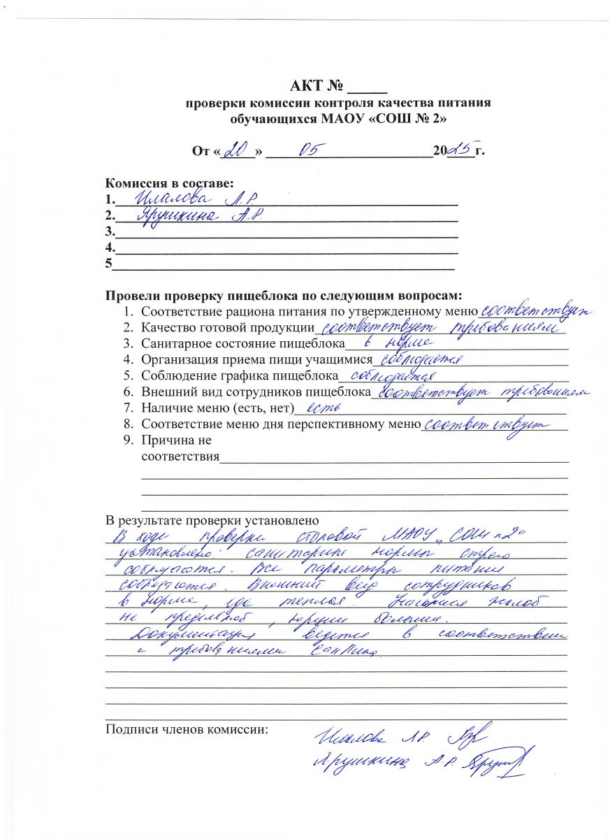 Акт проверки комиссии контроля качества питания от 20.05.2025