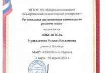 Победитель в региональной дистанционной олимпиаде по русскому языку 12.04.2021