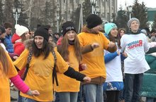 Сегодня ученики школ собрались на площади города,чтобы встать на зарядку.Будем надеяться,что утренняя зарядка станет для них ежедневным занятием.
