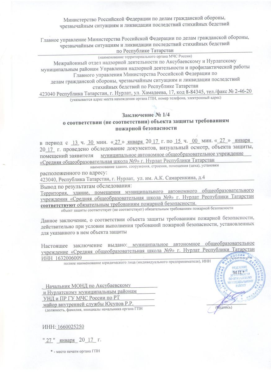 Заключение о соответствии объекта защиты требованиям пожарной безопасности/Яклау объектының янгын куркынычсызлыгы таләпләренә туры килүе турында бәяләме