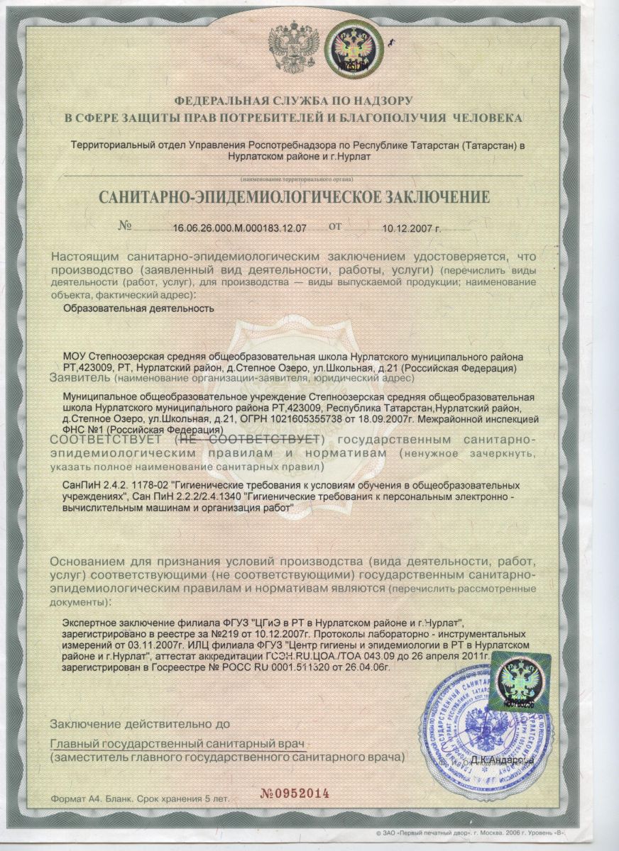 Санитарно - эпидемиологическое заключение от 10.12.2007 г.
