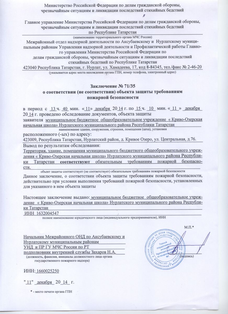 Заключение №71/35 о соответствии (не соответствии) объекта защиты требованиям пожарной безопасности / Саклау объектының янгын куркынычсызлыгы таләпләренә туры килүе (туры килмәве) турында 71/35 номерлы бәяләмә