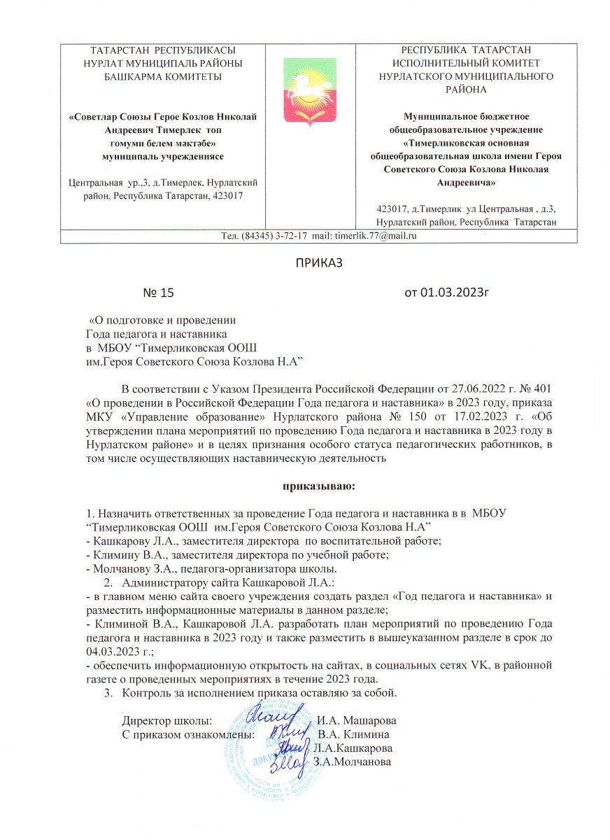Приказ проведения Год педагога и наставника в МБОУ Тимерликовская ООШ