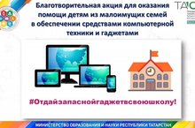 В рамках организации дистанционной формы обучения Министерством образования и науки Республики Татарстан инициирована благотворительная акция для оказания помощи детям из малоимущих семей в обеспечении средствами компьютерной техники и гаджетами (#отдайзапаснойгаджетвсвоюшколу). Таким образом, любой житель Республики Татарстан может оказать посильную помощь детям из малоимущих семей и принести в школу запасные (неиспользуемые) средства компьютерной техники и мобильные устройства для создания условий дистанционного обучения.