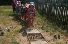 С целью укрепления здоровья детей совместно с родителями мы сделали профилактическую "дорожку здоровья.» Дорожка здоровья является хорошим помощником в оздоровительной работе для закаливания и профилактики плоскостопия. Для формирования каркаса использовали вагонку,а так же следующий материал: шишки еловые, бруски, булыжники среднего размера, крышки пластиковые, речной песок.Дети с удовольствием ходят по дорожке здоровья.