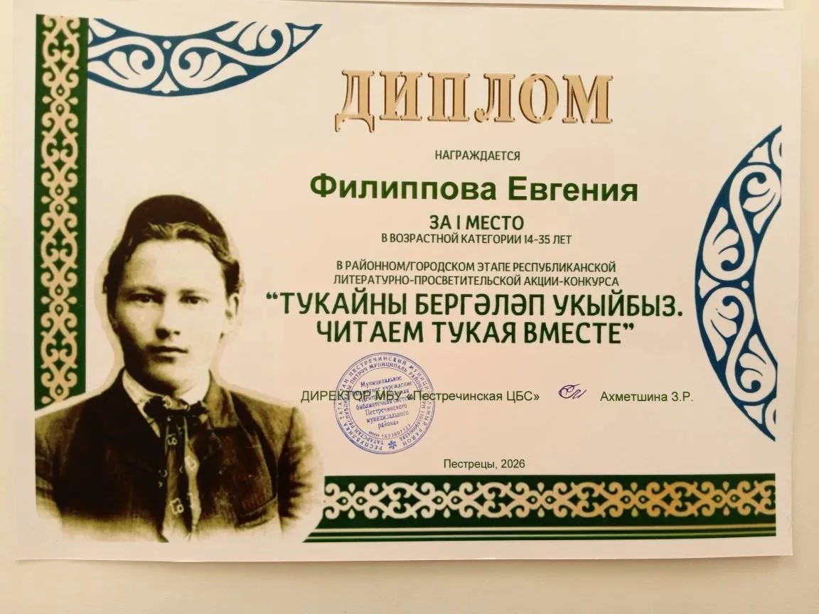 Ученица нашей школы Филиппова Евгения заняла 1 место на районном этапе республиканского литературного конкурса "Читаем Тукая вместе", организованного Пестречинской системой библиотеки. Эта победа - большая гордость и радость для нас. Своими стараниями и способностями Евгения проявила свою любовь к татарской литературе.