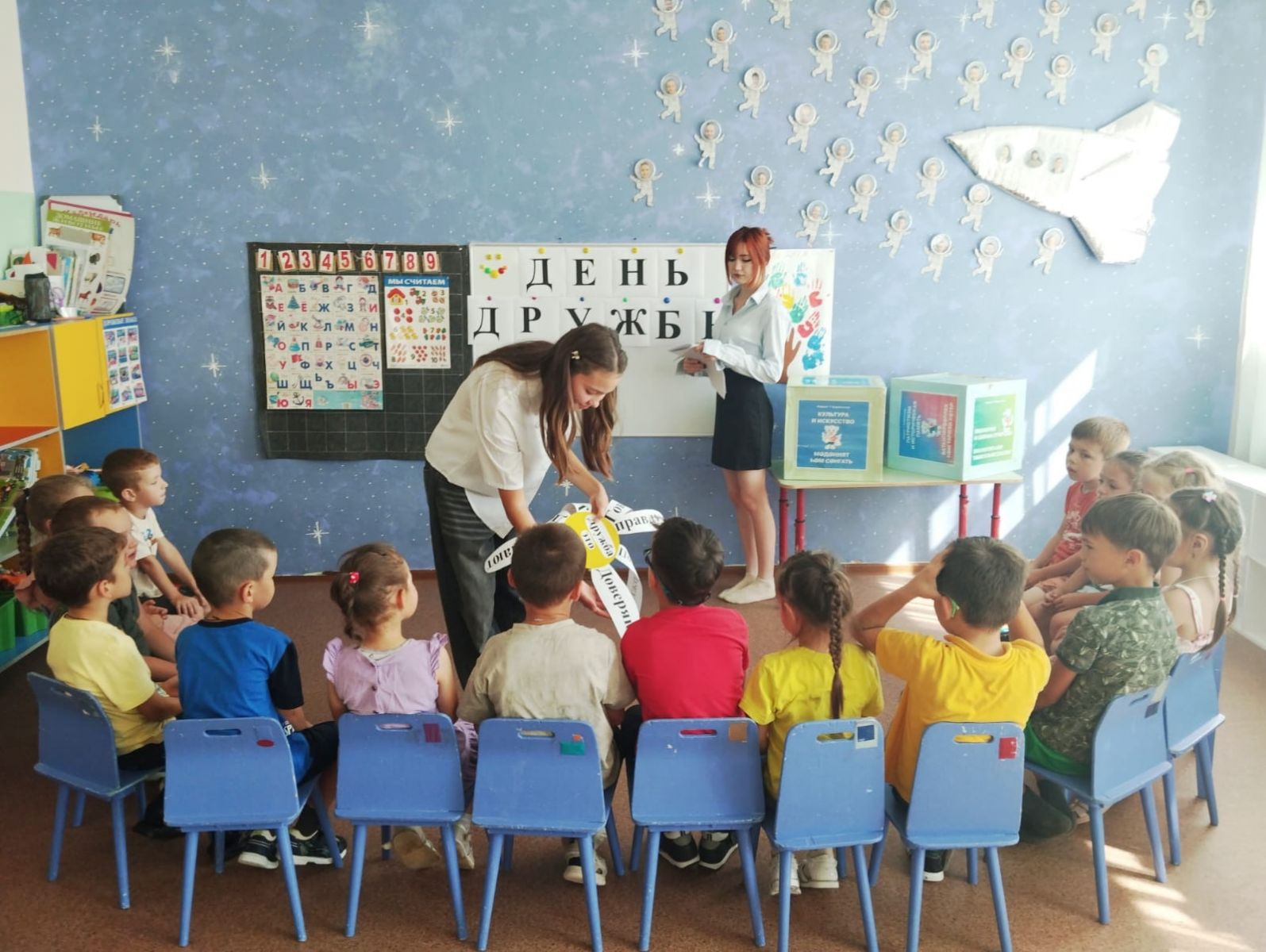 Также были представлены фрагменты занятий с детьми старшей и подготовительной групп, дети показали свои первоначальные умения и навыки в программировании. Педагоги детский садов районная также принимали участие и выполняли задания вместе с детьми.