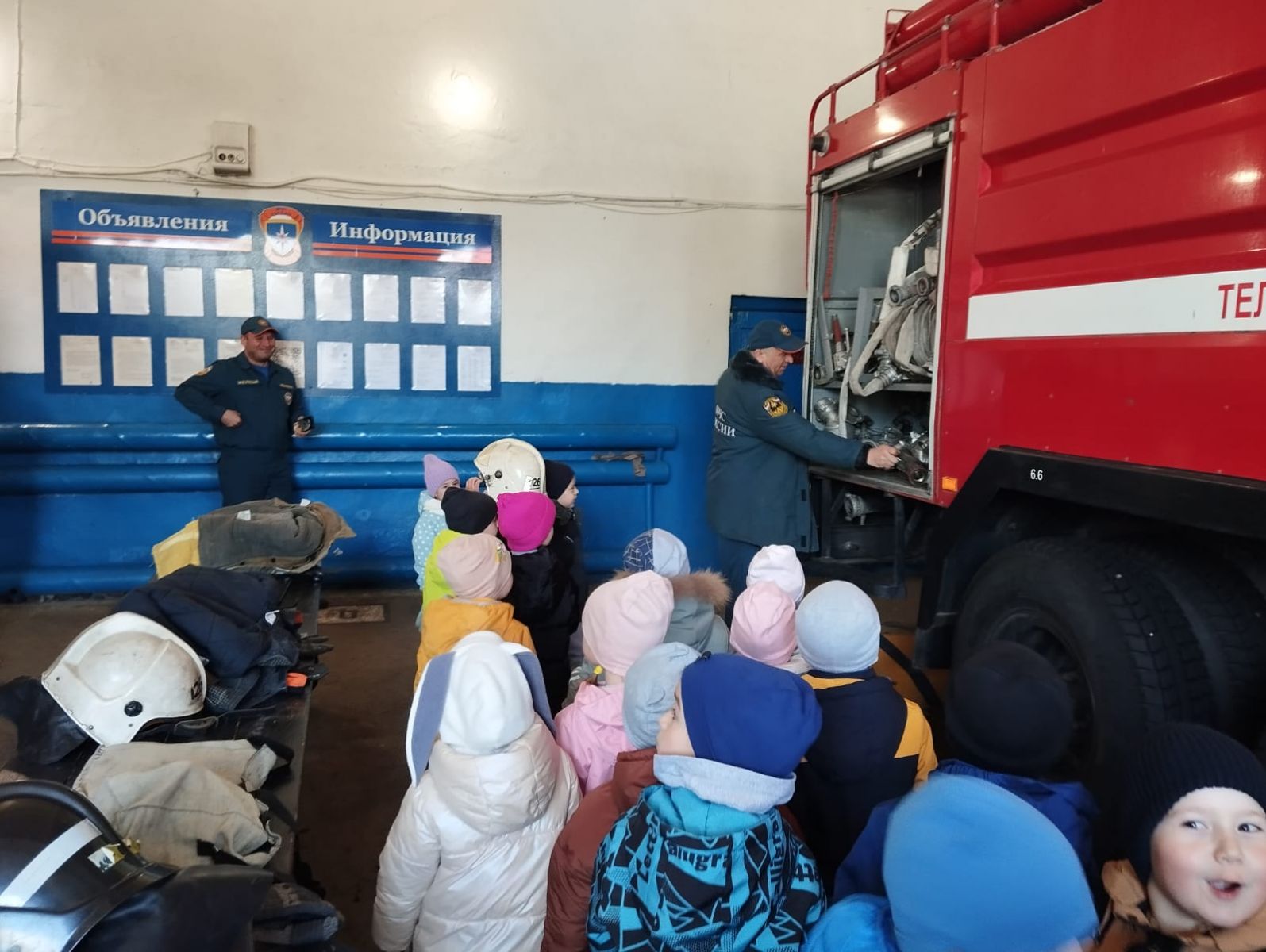 Ребятам показали диспетчерский пункт, гараж с автомобилями. Но наибольший интерес вызвала пожарная машина и ее оснащение, а также боевая одежда пожарного. Дети угадывали для чего нужно то или иное спасательное оборудование и задавали многочисленные вопросы, а также примерили на себя каску пожарного и средство индивидуальной защиты.
